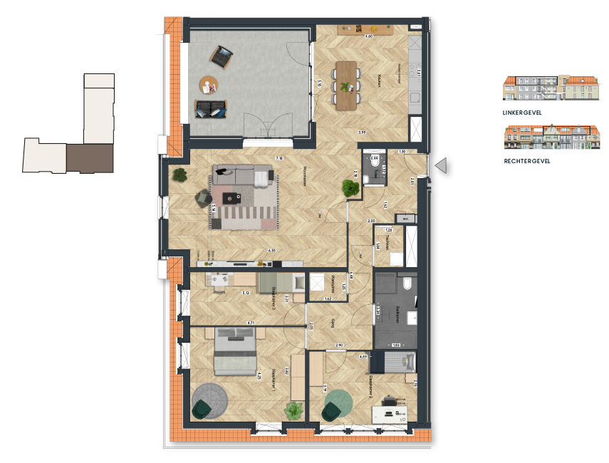 Bouwnummer 13 biedt verder drie riante slaapkamers, een badkamer, een separaat tweede toilet én een praktische technische ruimte waar u onder andere de wasmachine een plek kunt geven. Het dakterras is rechtstreeks bereikbaar vanuit de woonkamer, zodat u optimaal kunt genieten van zon, rust en ruimte.